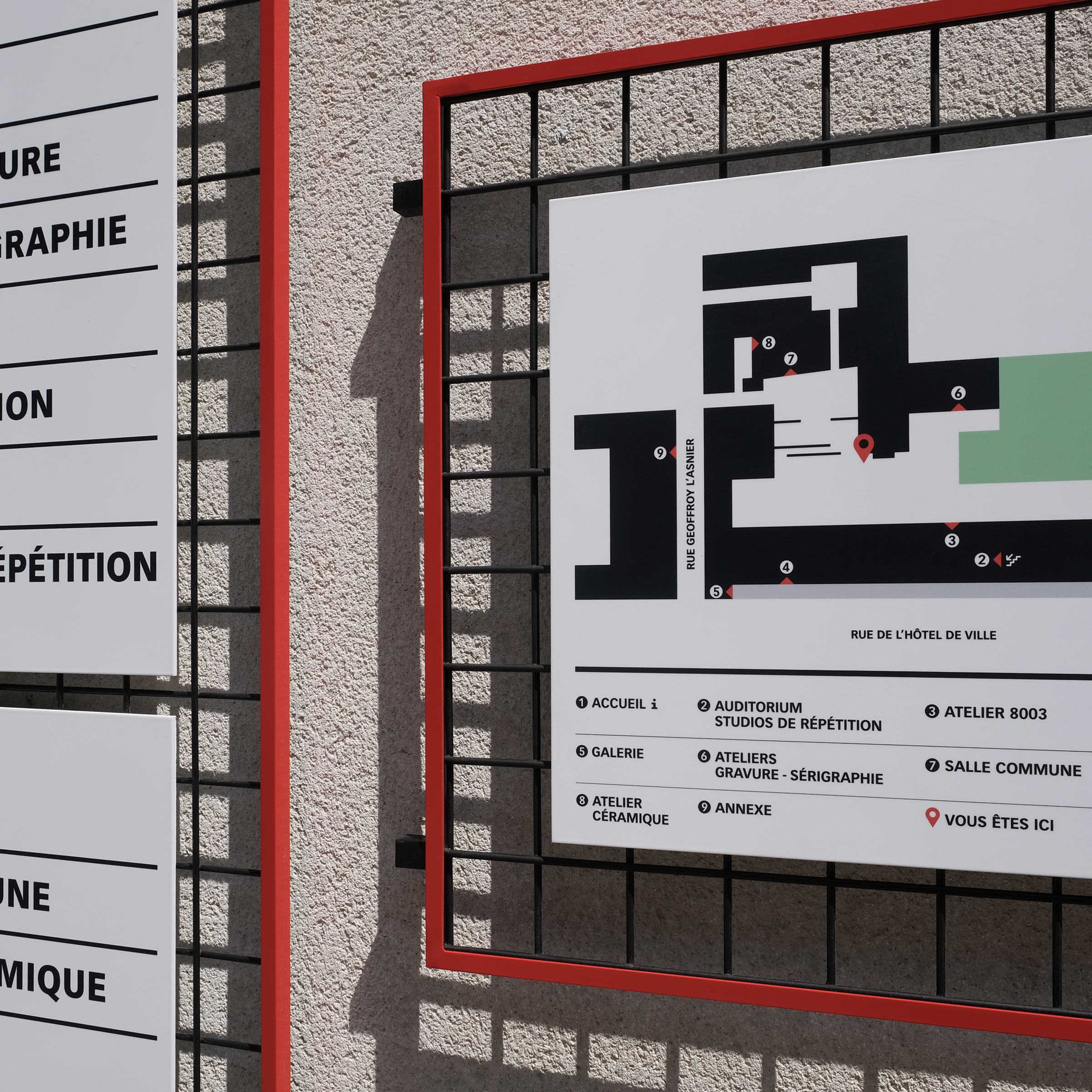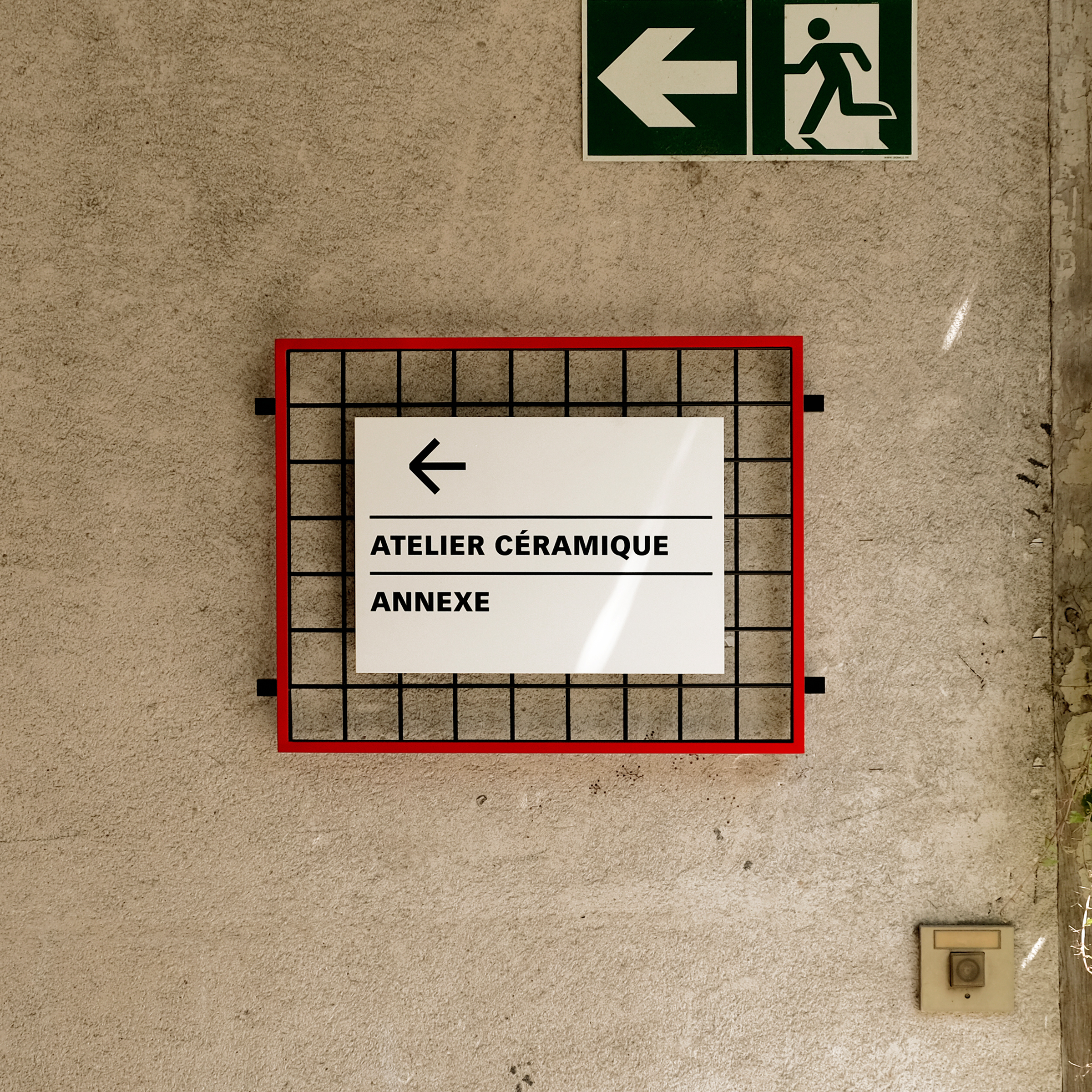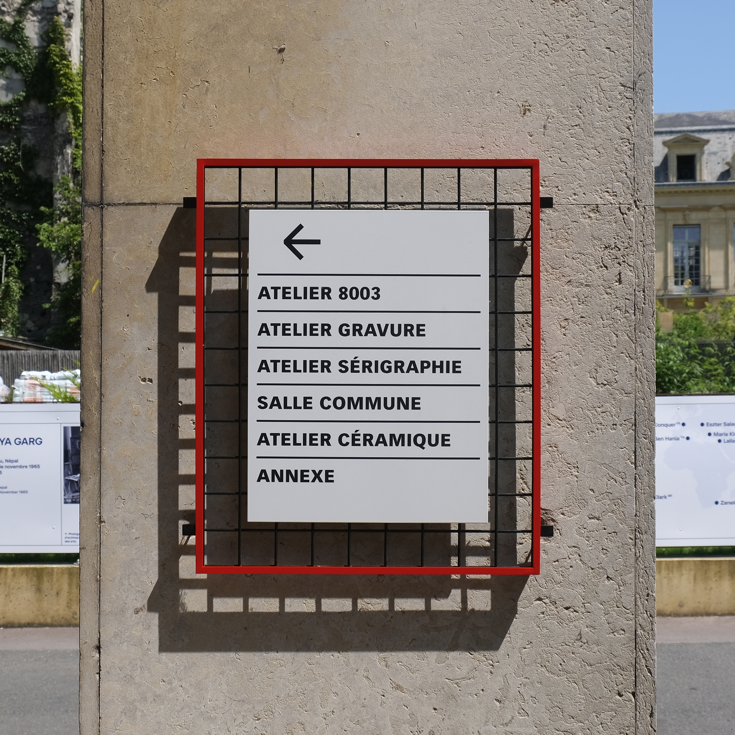 La Cité internationale des arts est une résidence d’artistes qui rassemble, au cœur de Paris, des artistes et leur permet de mettre en œuvre un projet de création ou de recherche dans toutes les disciplines. La signalétique est conçue en dialogue avec les spécificités architecturales et contextuelles du site, et s’y intègre harmonieusement. Les matériaux, issus de l’industrie, sont sélectionnés pour leur efficacité économique, puis adaptés au projet et placés dans un nouveau contexte d’usage – à l’image du lieu lui-même, qui ne cesse de se recontextualiser.