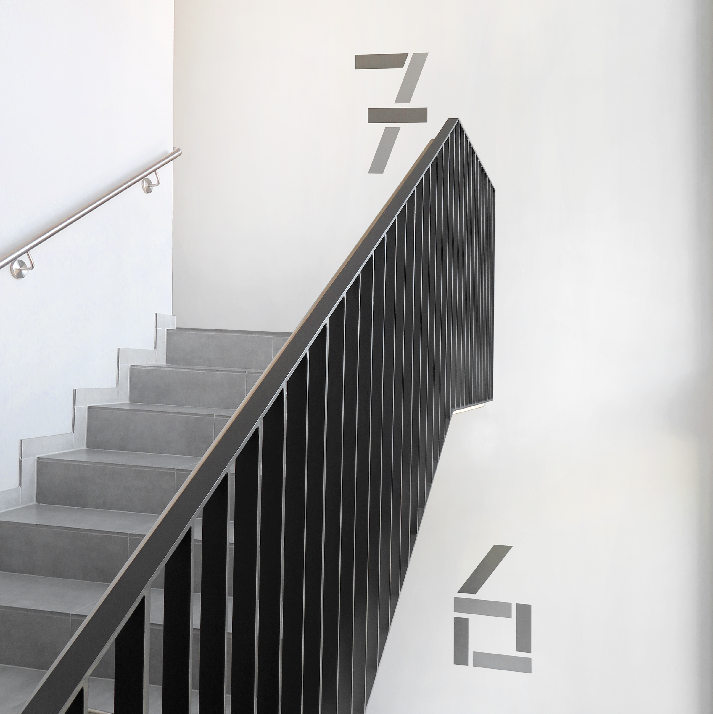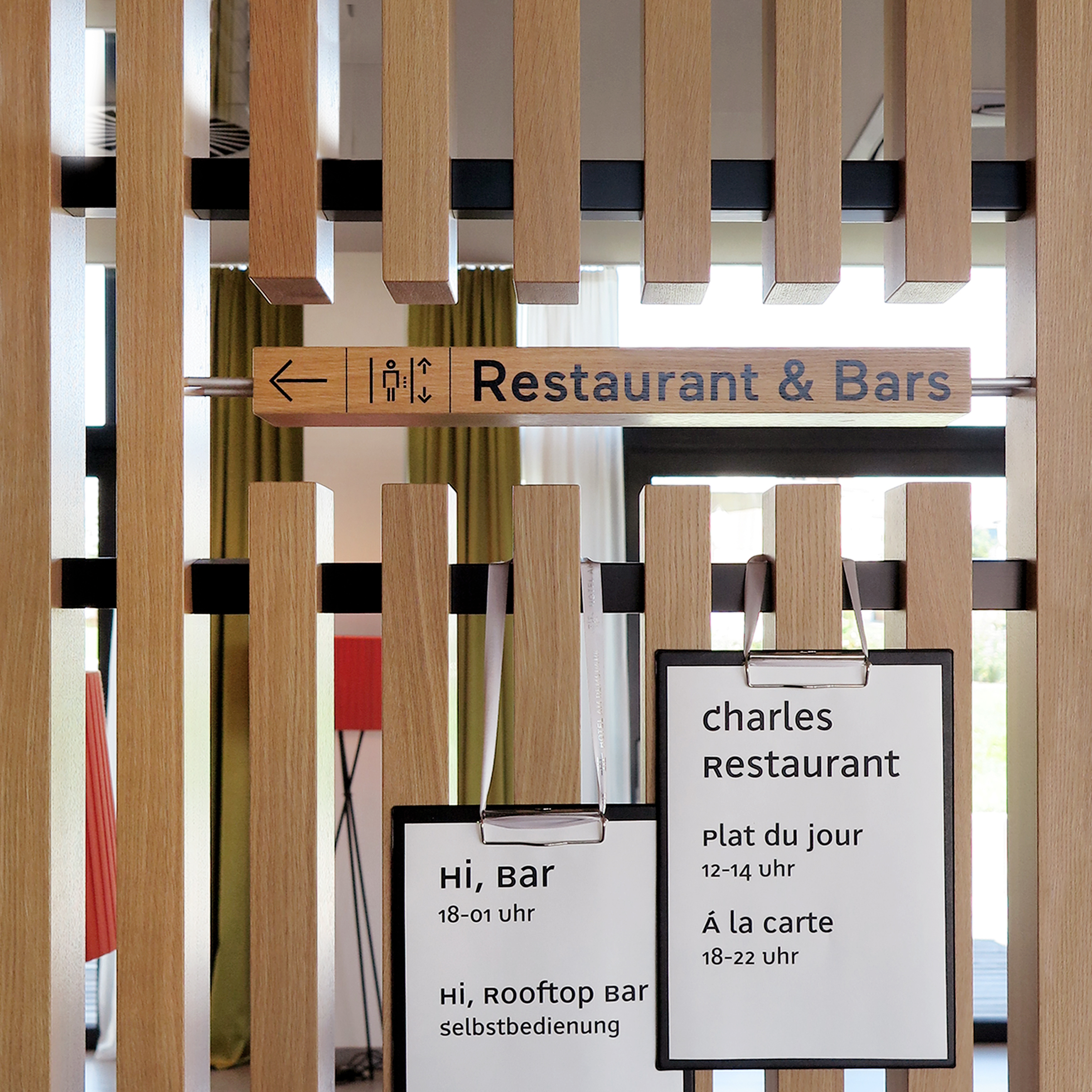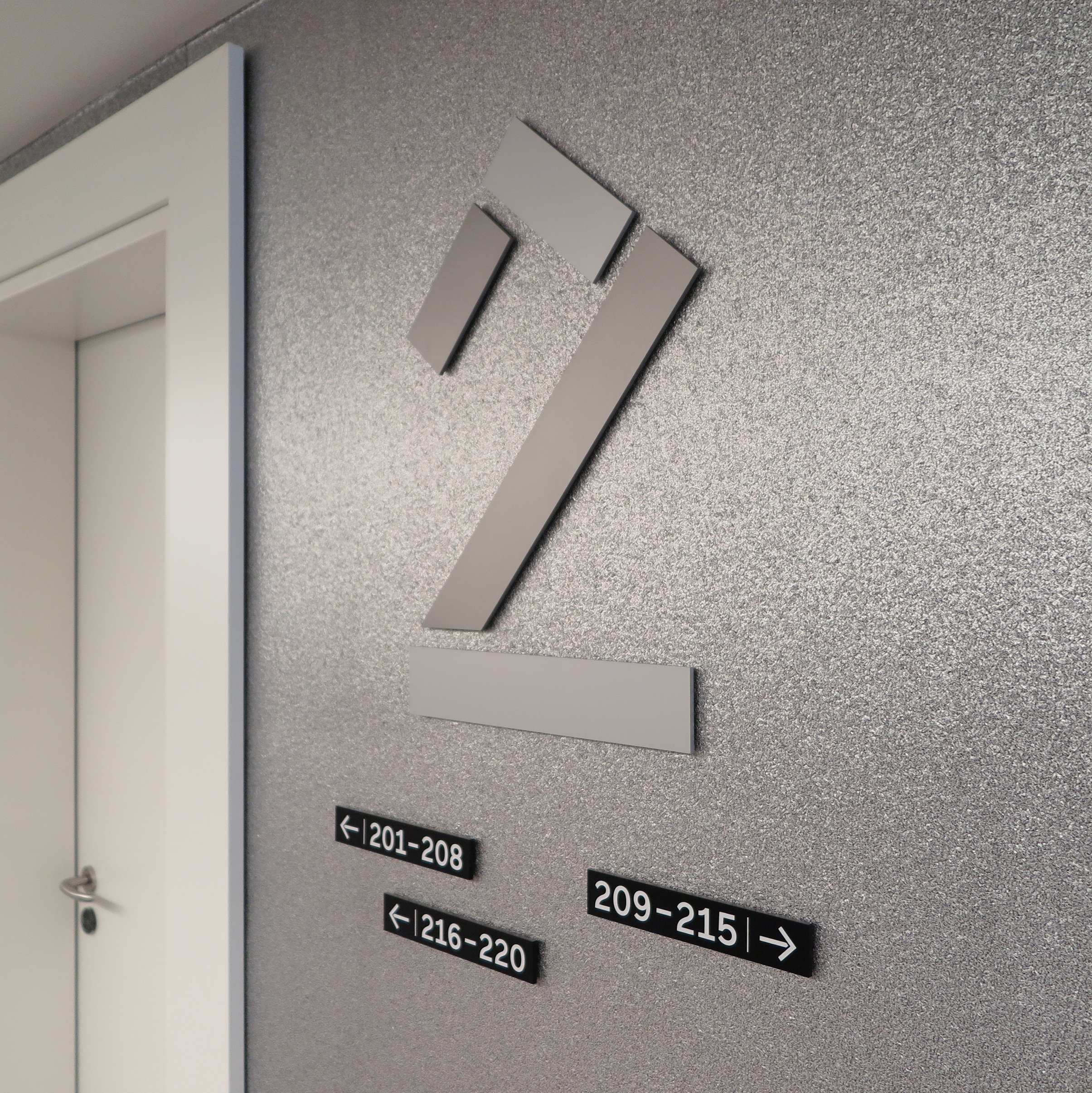 L’hôtel d’affaires am Remspark est situé à Schwäbisch Gmünd. La façade du bâtiment reflète le paysage urbain ainsi que la longue tradition de l’orfèvrerie propre à la ville. Le système de signalétique s’inspire de cet héritage ainsi que de l’identité visuelle que nous avons également conçue pour le projet. Les éléments de signalétique sont intégrés à l’architecture et s’y adaptent avec discrétion. L’objectif était de ne pas surcharger le lieu, mais de fournir les informations essentielles, aux bons endroits.