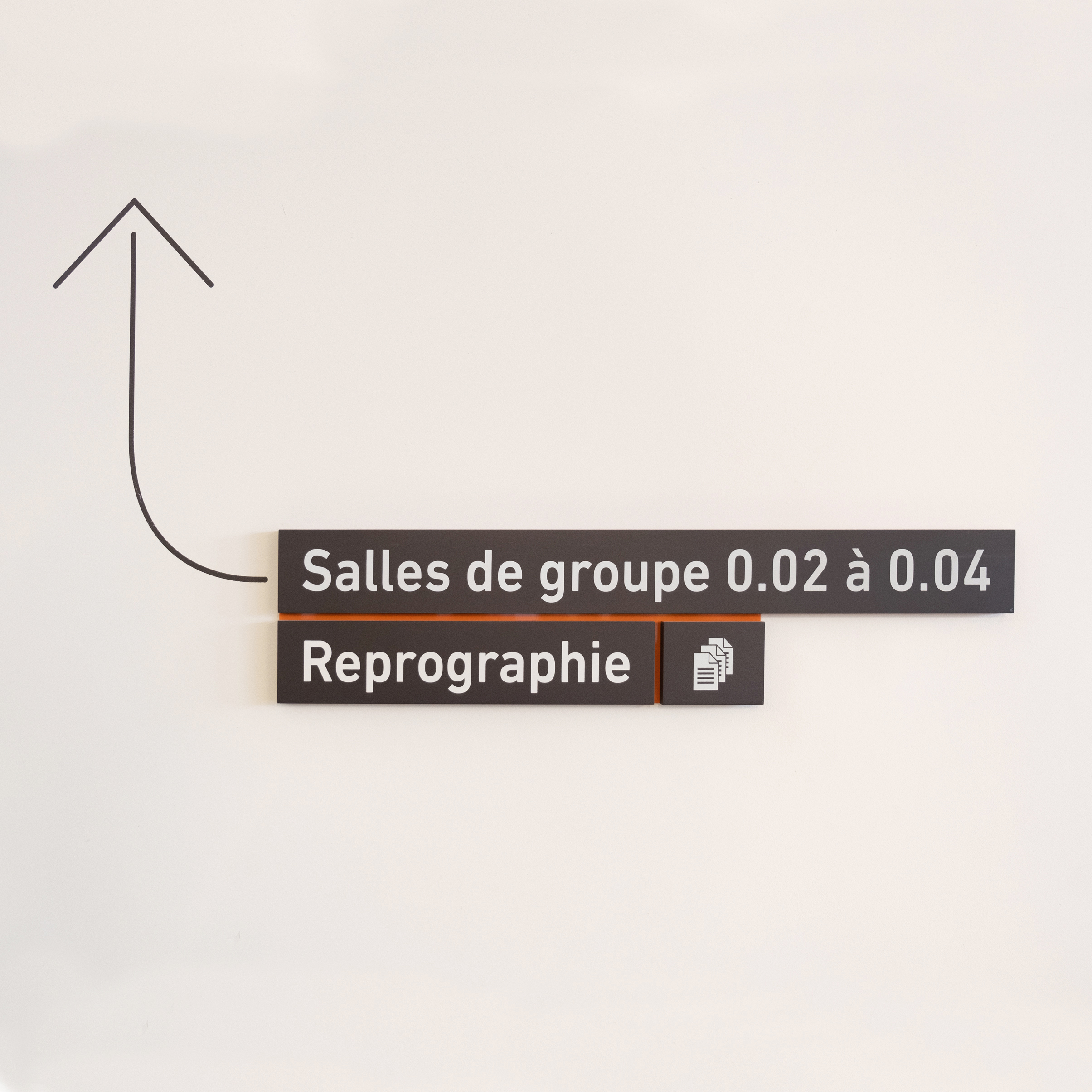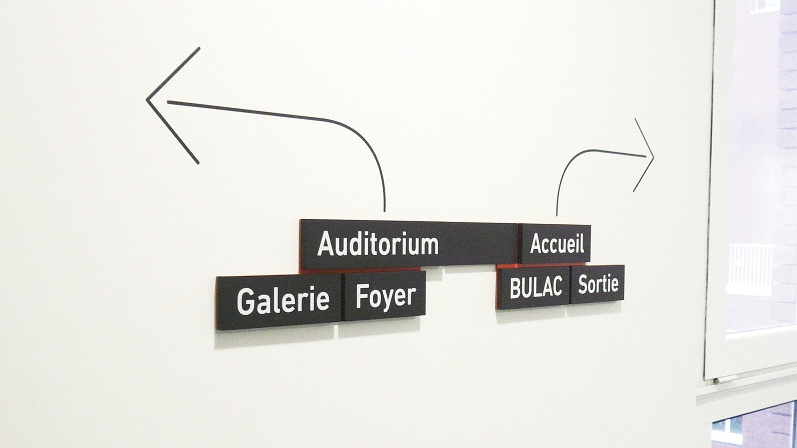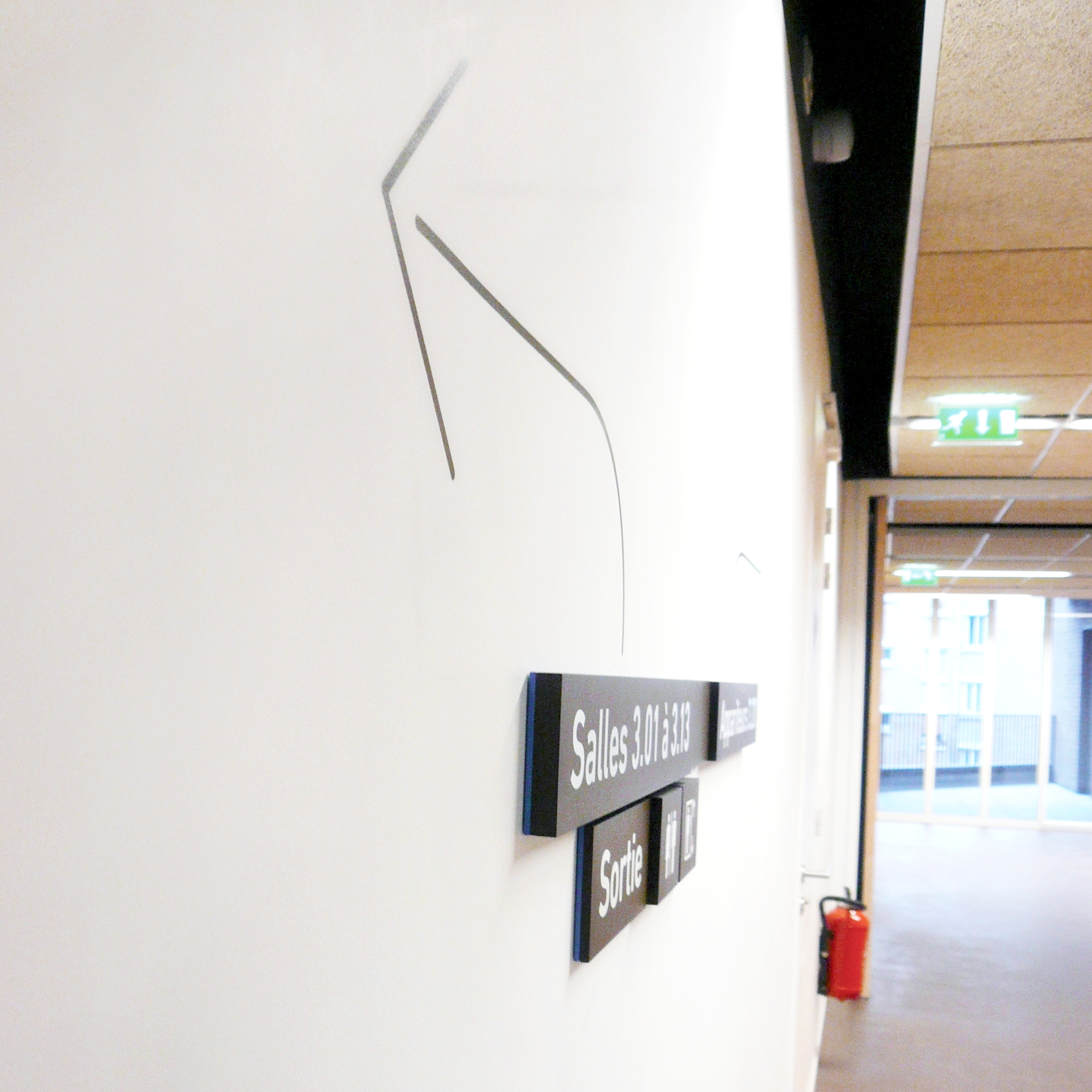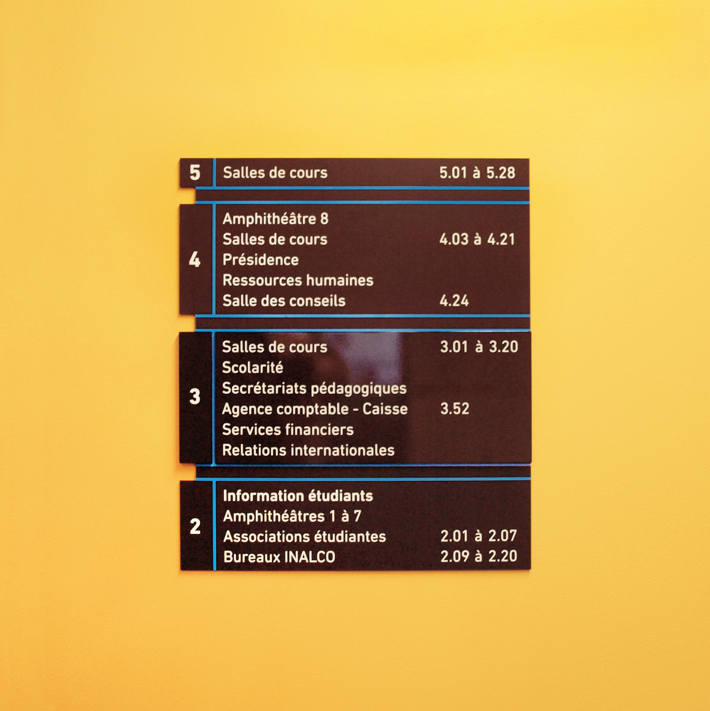 Le système de signalétique s’inspire des arbres linguistiques, en résonance avec la vocation de ces institutions de recherche. Un mobile, placé au centre du hall d’entrée, marque le point de départ de la répartition bipartite du bâtiment. Les informations se déploient dans l’espace comme les éléments d’un diagramme.