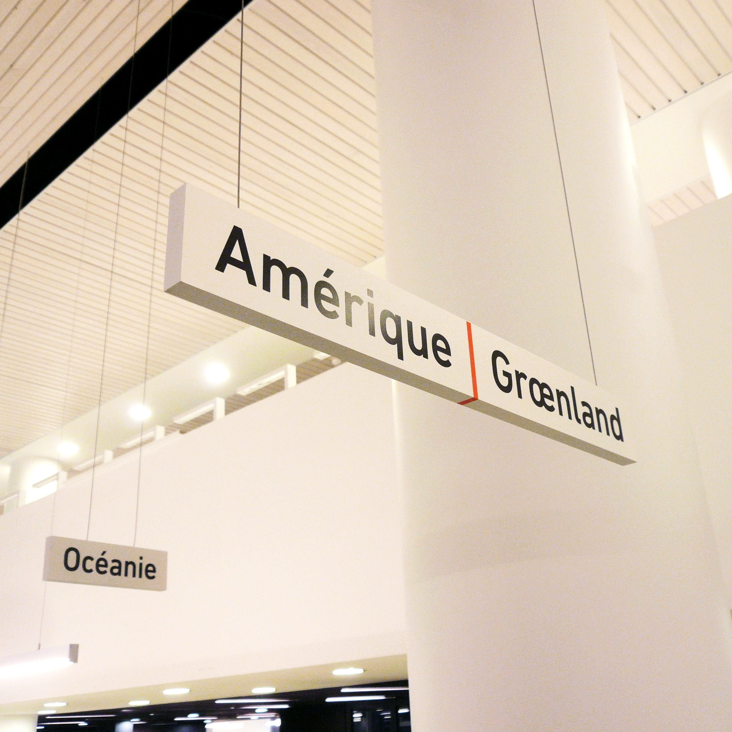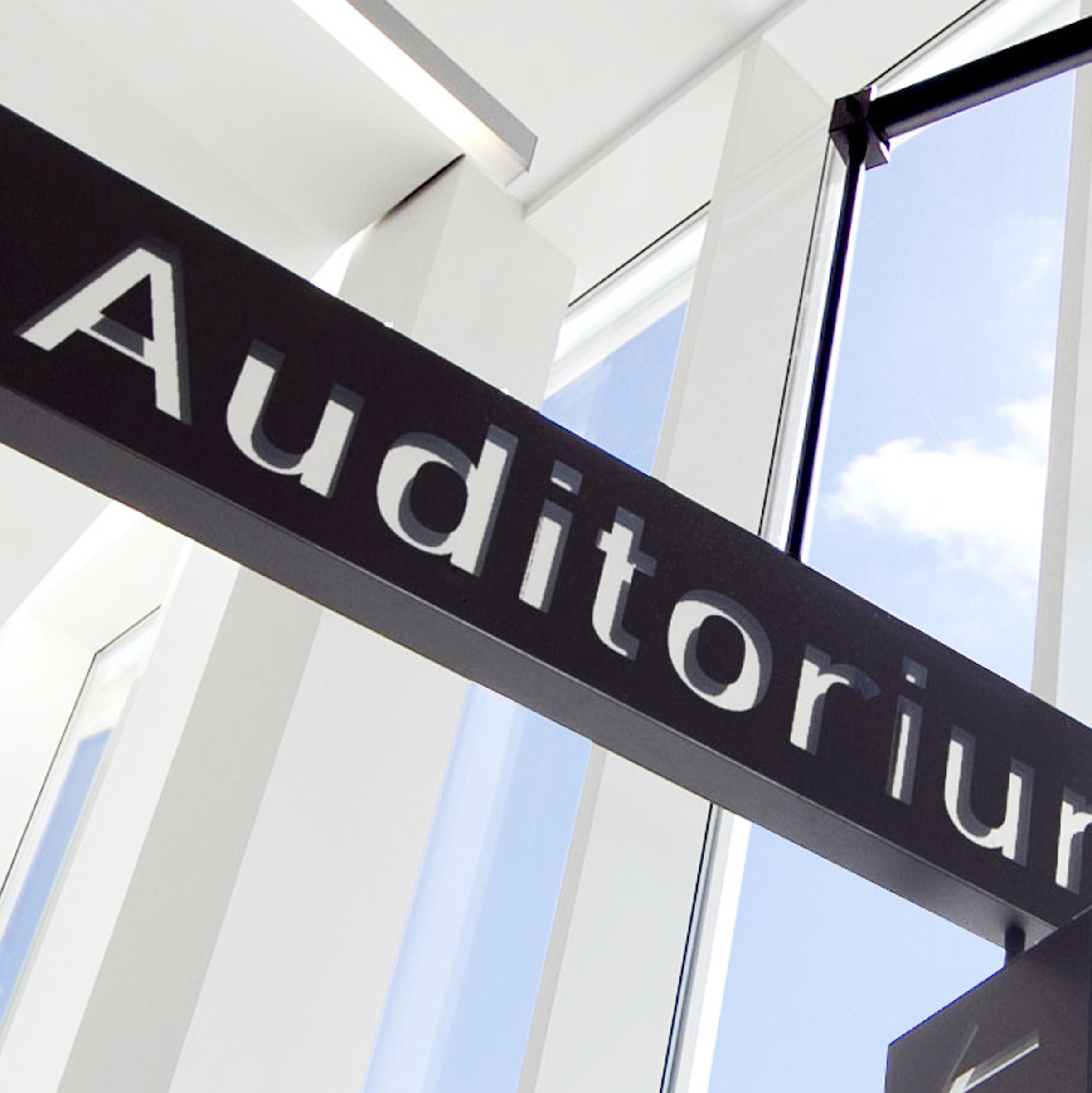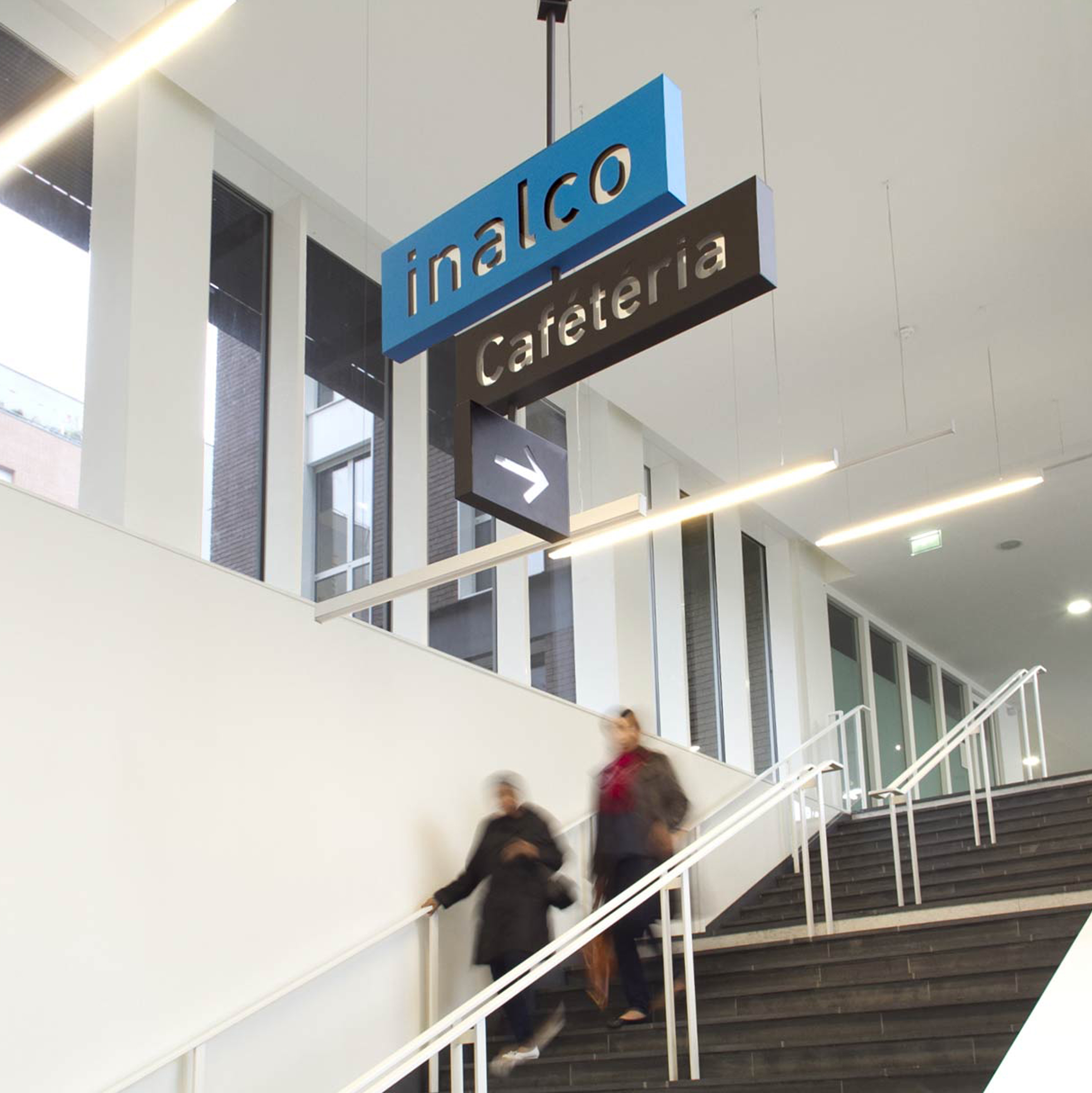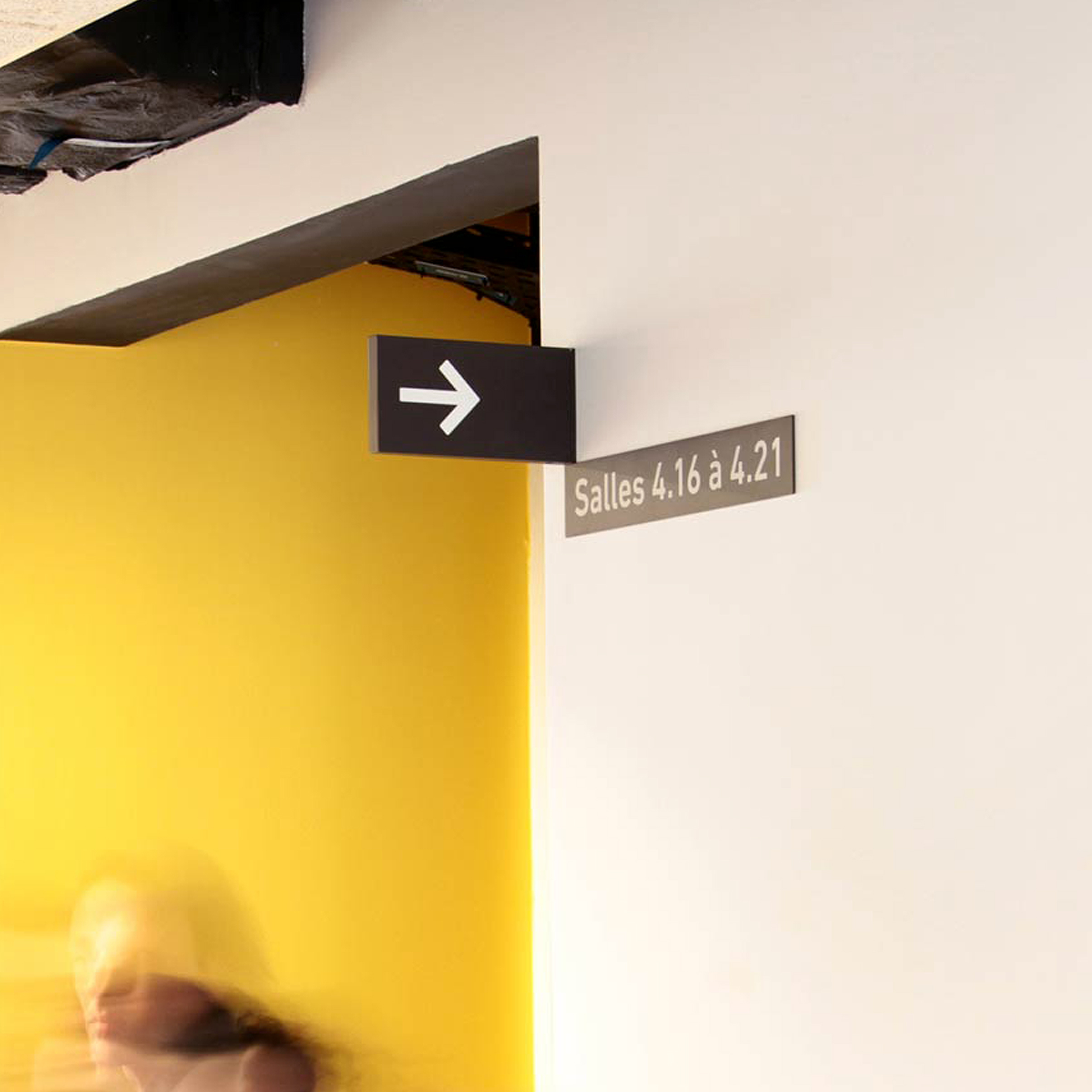 Le système de signalétique s’inspire des arbres linguistiques, en résonance avec la vocation de ces institutions de recherche. Un mobile, placé au centre du hall d’entrée, marque le point de départ de la répartition bipartite du bâtiment. Les informations se déploient dans l’espace comme les éléments d’un diagramme.