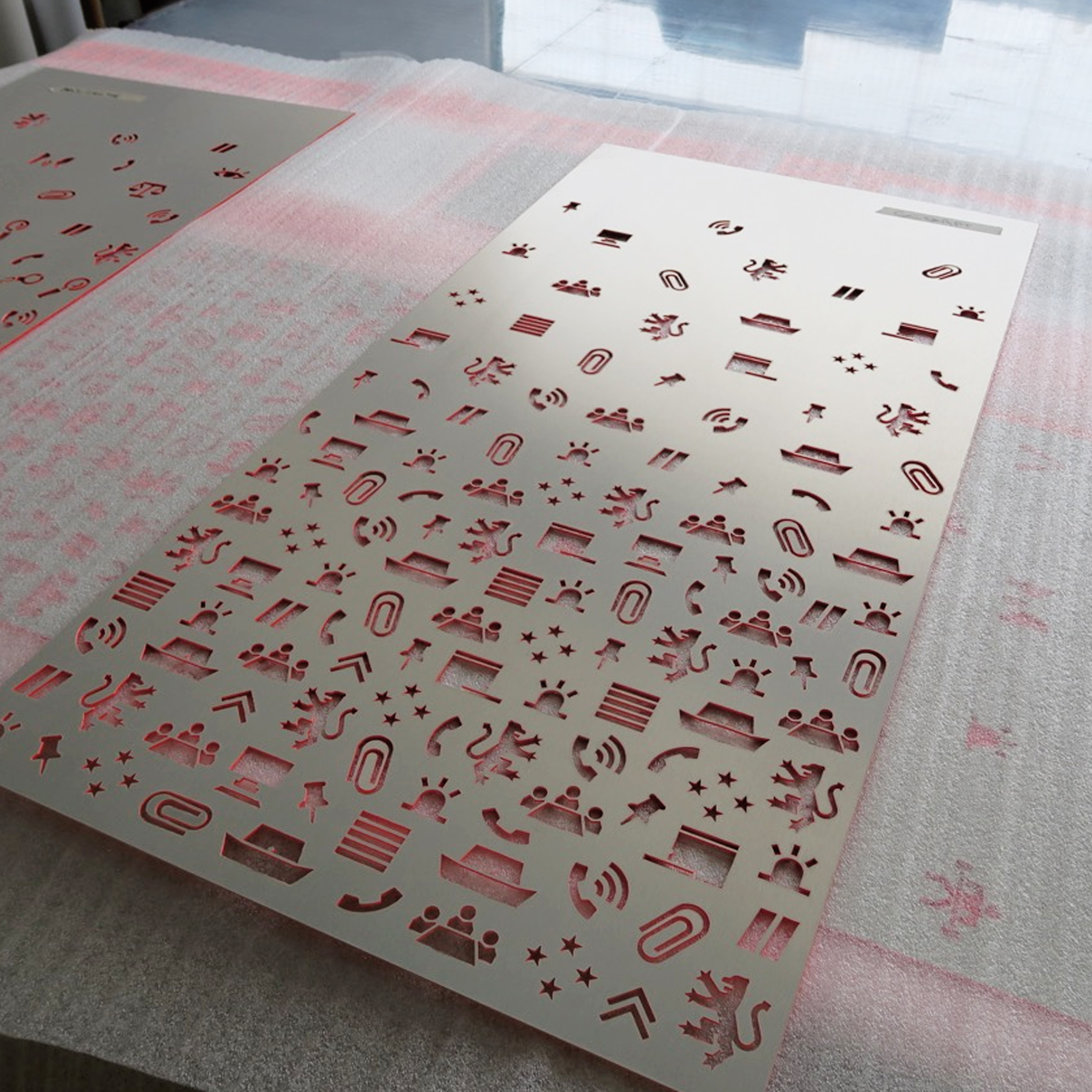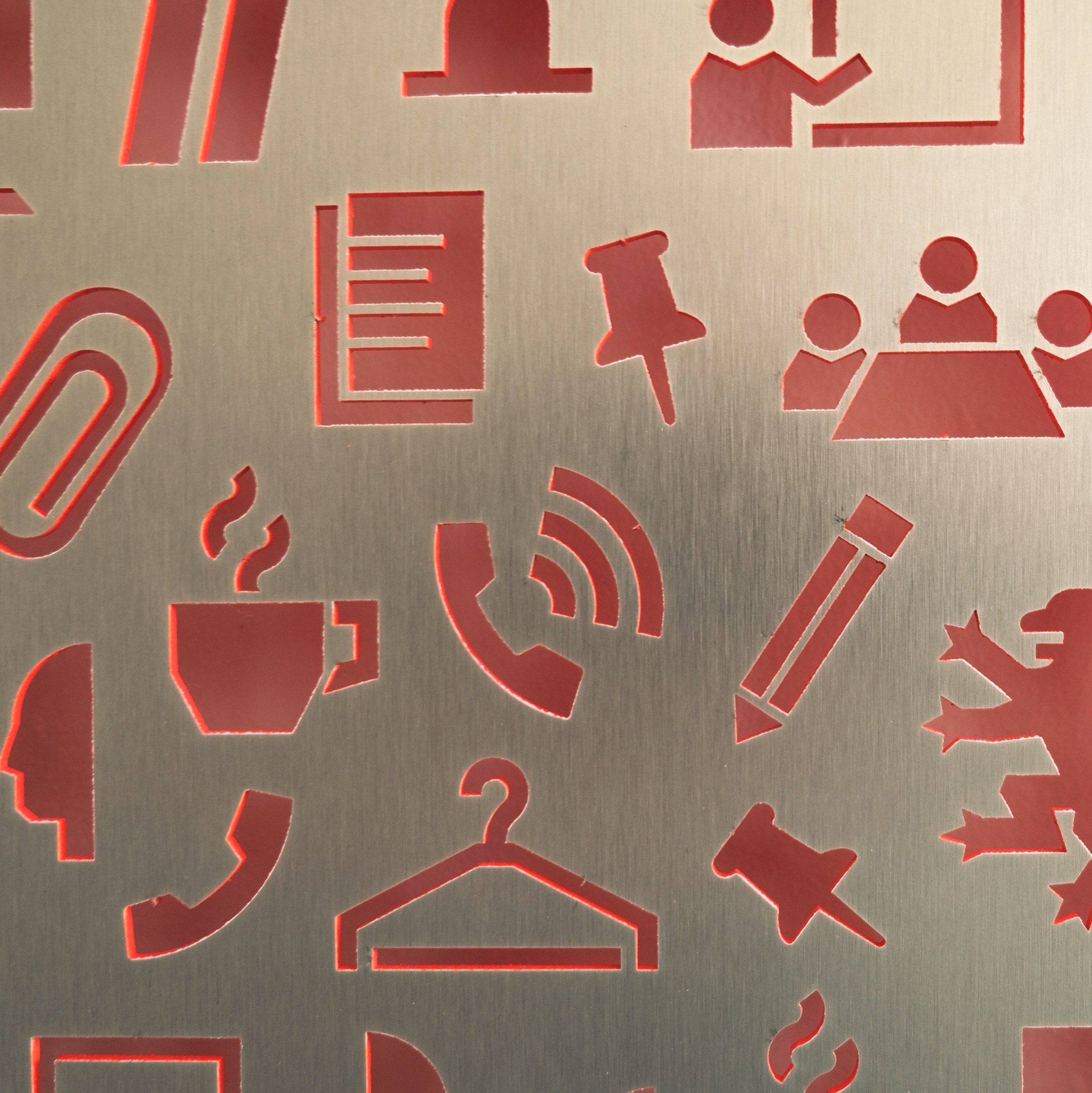 Le système de signalétique a été conçu dans le cadre d’un projet 1% artistique pour le nouveau quartier de la Gendarmerie à Arras. Les lames verticales en acier inoxydable, découpées au laser, qui se déploient sur la façade et la toiture, ainsi que le rythme qu’elles instaurent, confèrent au bâtiment son identité graphique.