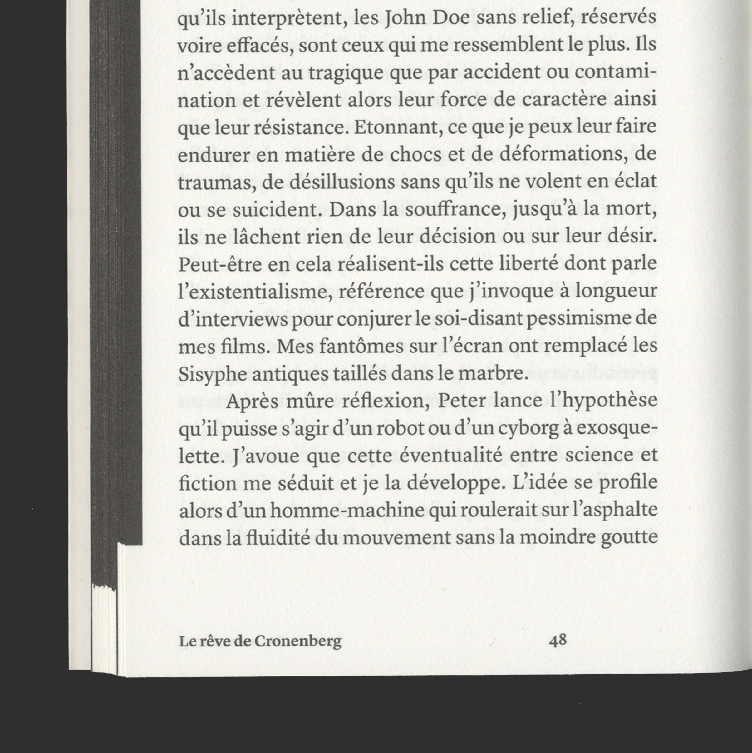 La mise en page traduit cette structure tripartite en modifiant le système de marges à chaque « rideau fermé » marquant la fin d’un chapitre.