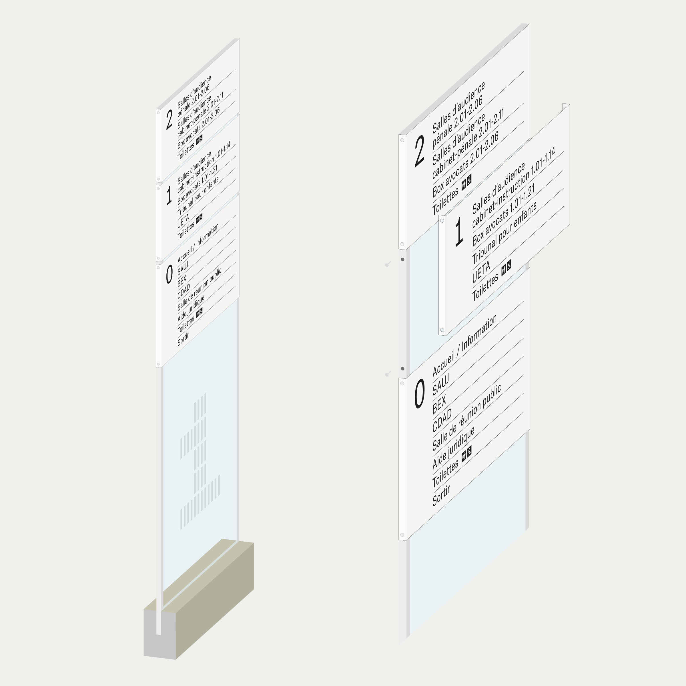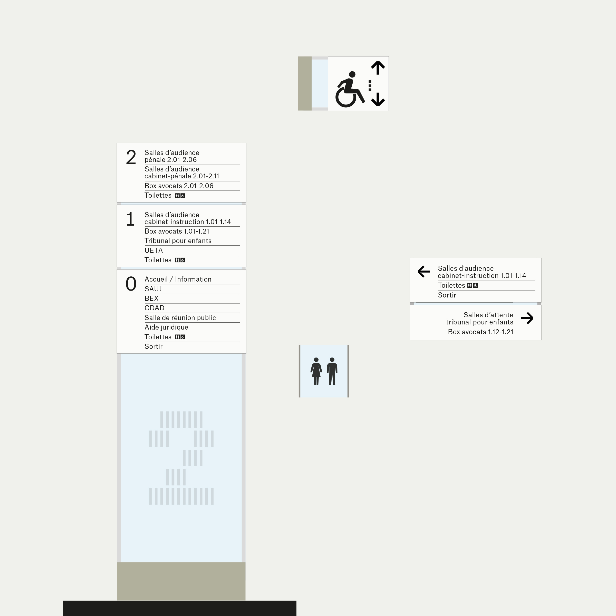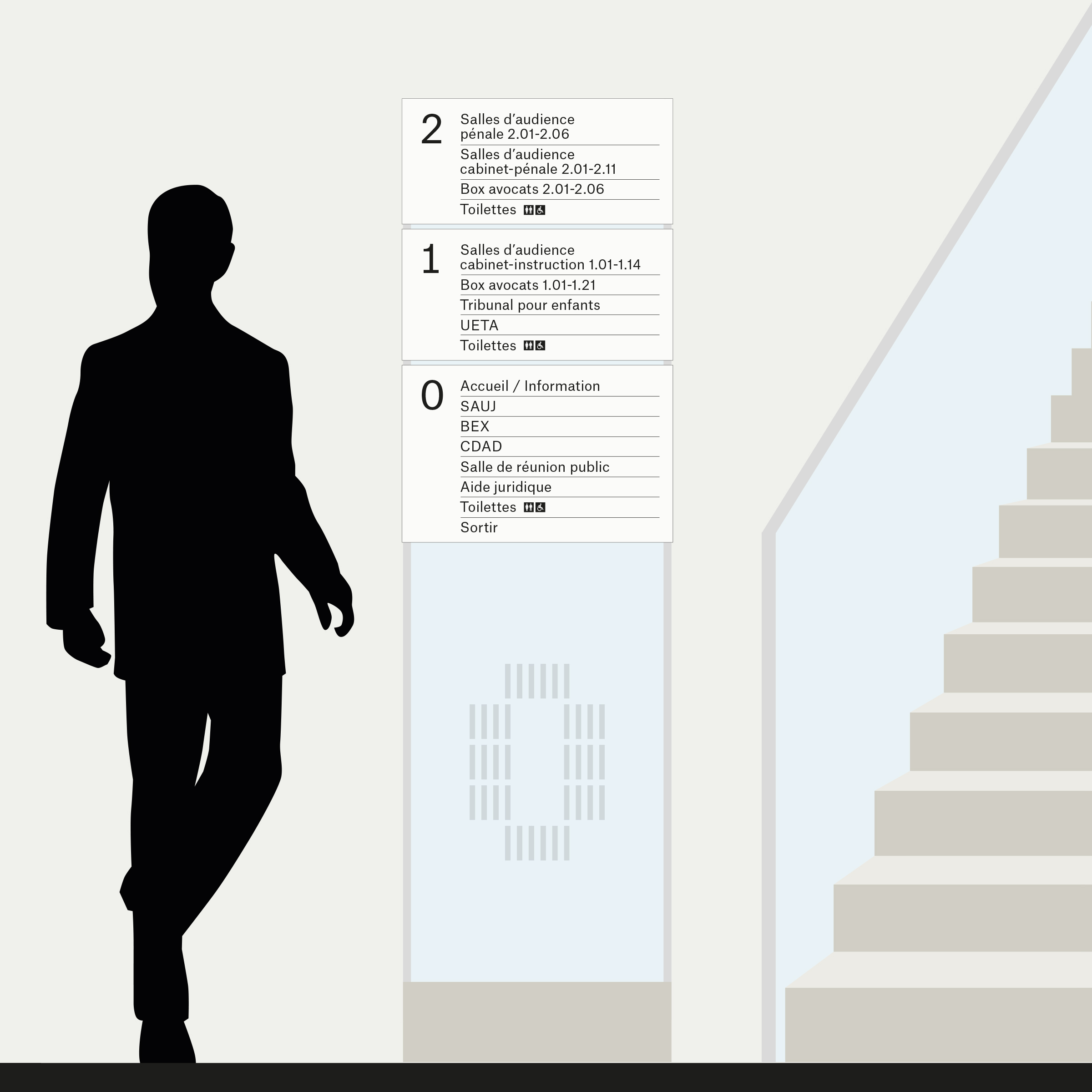 Le concept de la signalétique s’appuie sur la structure en grille de la façade. Celle-ci sert de base à la conception des éléments bi- et tridimensionnels nécessaires au système d’orientation. Ce principe permet d’établir une cohérence et un dialogue entre l’extérieur et l’intérieur du bâtiment.